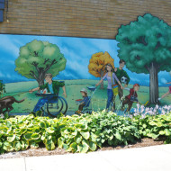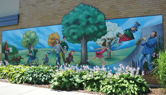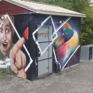 Murale de type graffiti mettant en relief l’intégration de l’installation sportive à l’environnement du site.