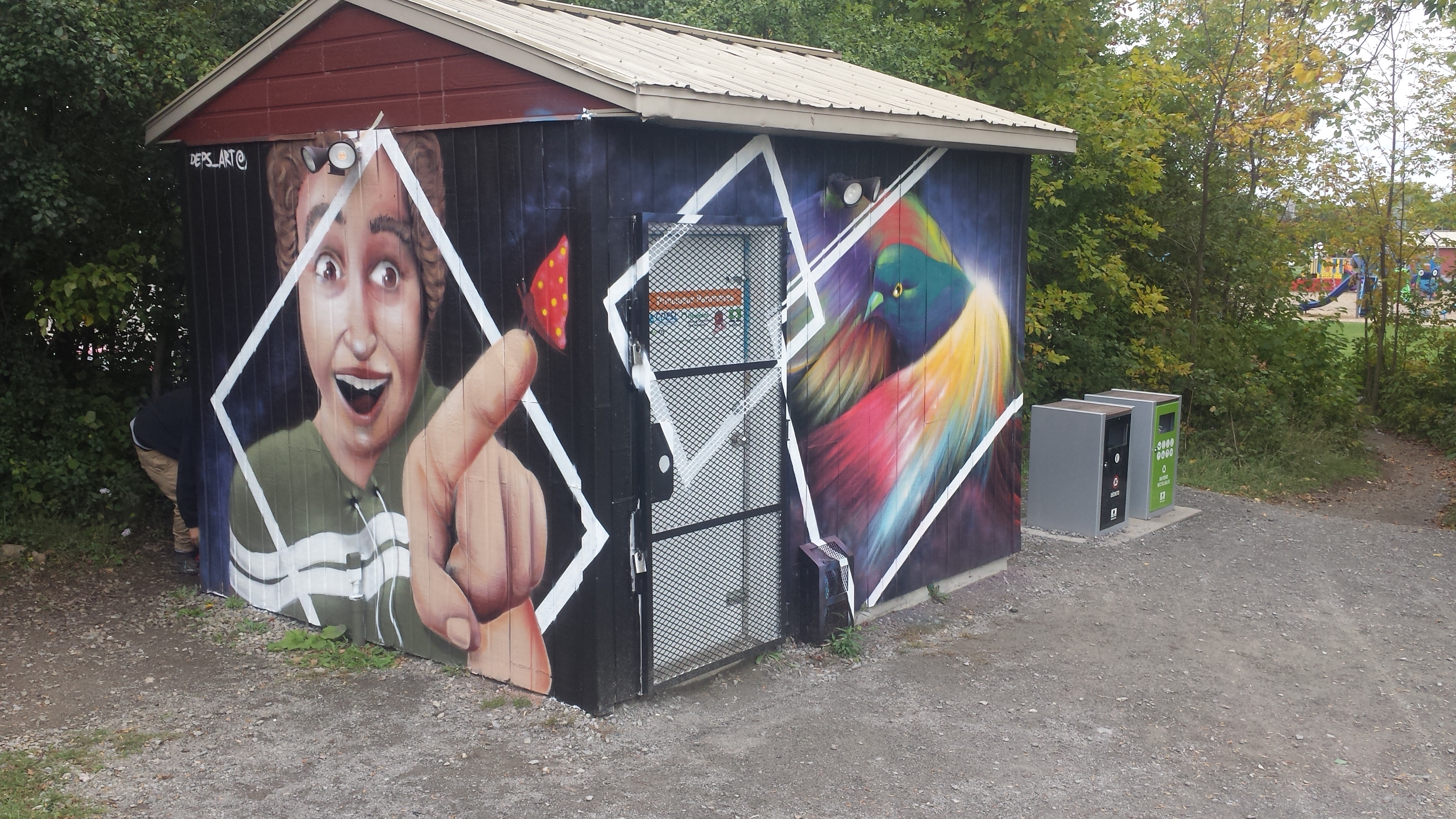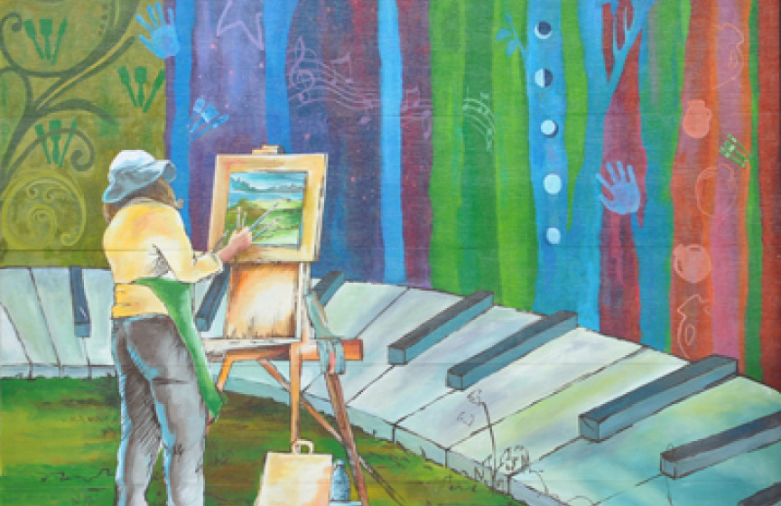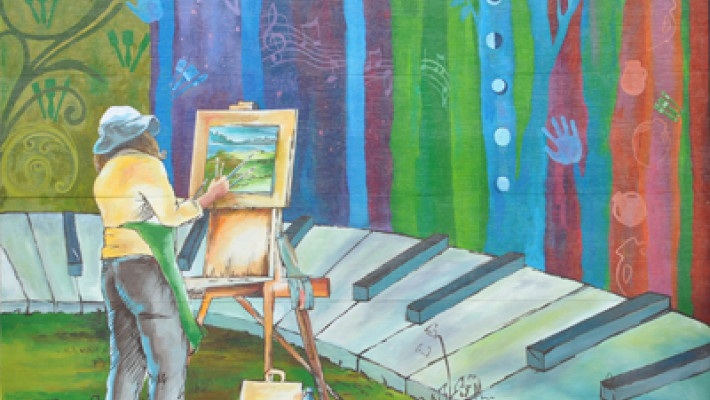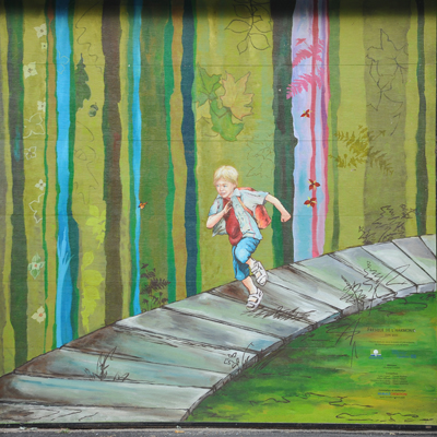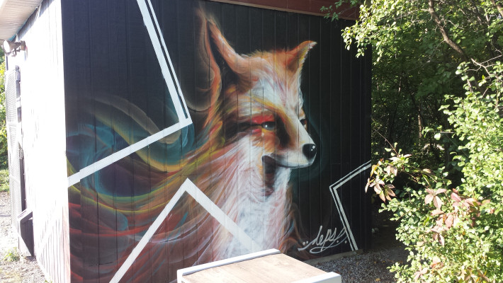 Murale de type graffiti mettant en relief l’intégration de l’installation sportive à l’environnement naturel du site.