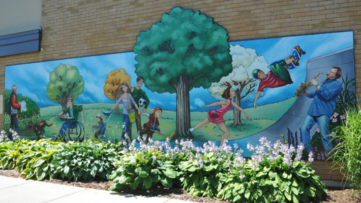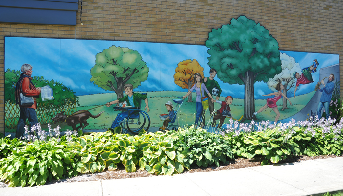 Scène représentant les activités variées offertes par la Ville de Boisbriand aux différentes clientèles à la Maison du citoyen et dans ses environs : aréna, bibliothèque, parcs, espaces verts, etc.